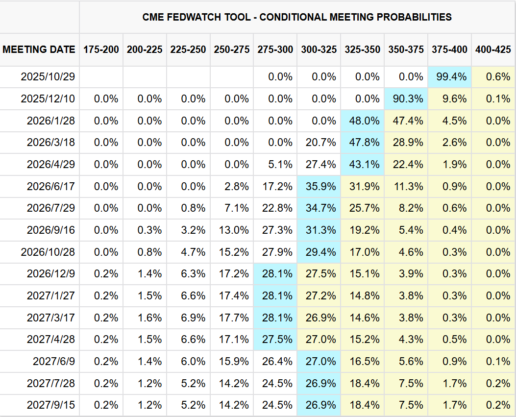 美元流动性也就是降息的预期变化,因为明年5月就换美联储主席了,所以明年上半年1、3、4月的三次议息会是核心,下半年大概率就被川普操纵了。美国就业确实很拉胯,最近互联网大厂又开始裁员了,随着AI的进步必然导致越来越多人失业,所以就业数据没道理会突然变好,因此我对持续降息还是偏乐观的。看一下fedwatch预测,今年两次25个基点已经板上钉钉了,明年1月的概率是48%。昨晚因为川普又骂了鲍威尔,所以1月份降息概率比前两天低了一丢丢,不过毕竟离得还远,到时候主要还是由服务业cpi和就业数据决定。