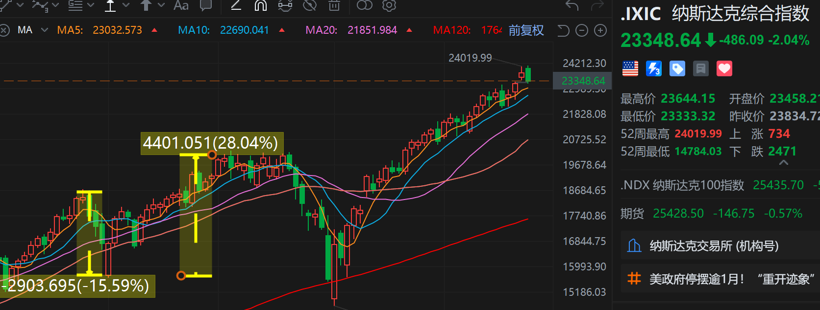 纳指在这个期间回撤了15%,之后触底反弹到24年底纳指又涨了28%。