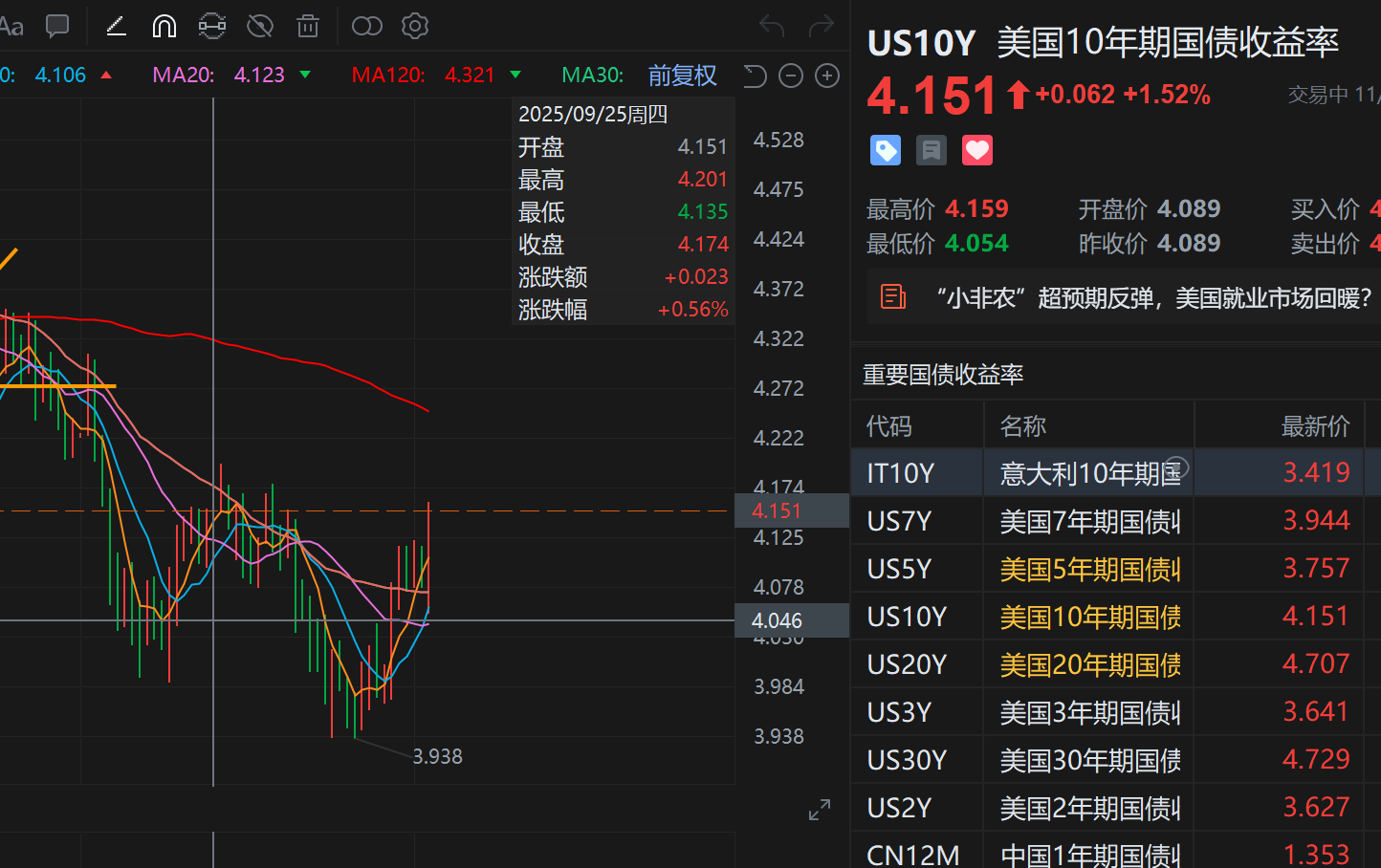 之后美债收益率上涨(美债下跌),10年期美债收益率回到4.15%了,已经明显高于今年9月16日启动降息的时候4.06%,这真的有点像去年9月份降息之后,长端美债的收益率走势。去年9月降息之前是3.6%,降完长端美债就开始反弹,因为市场觉得降息无法持续,通胀控制不住。结果是市场对了,美联储从1月份停止降息,一直到今年9月才重启降息。