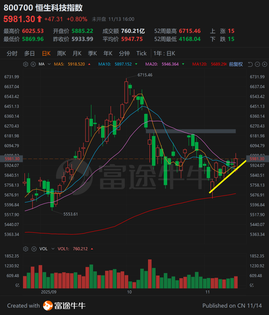 昨晚美股把本来走的好好的中国资产也带崩了,今天低开是比较确定了,看看能不能高走吧。目前日本是从低开-2%,反弹拉到了-1.48%,有可能中国资产也是这么个走势。但本来恒科已经走出趋势站上20日线了,被这么一搞,估计又要波动很久,直到12月份降息概率修复才有可能形成一波确定的反弹趋势了。