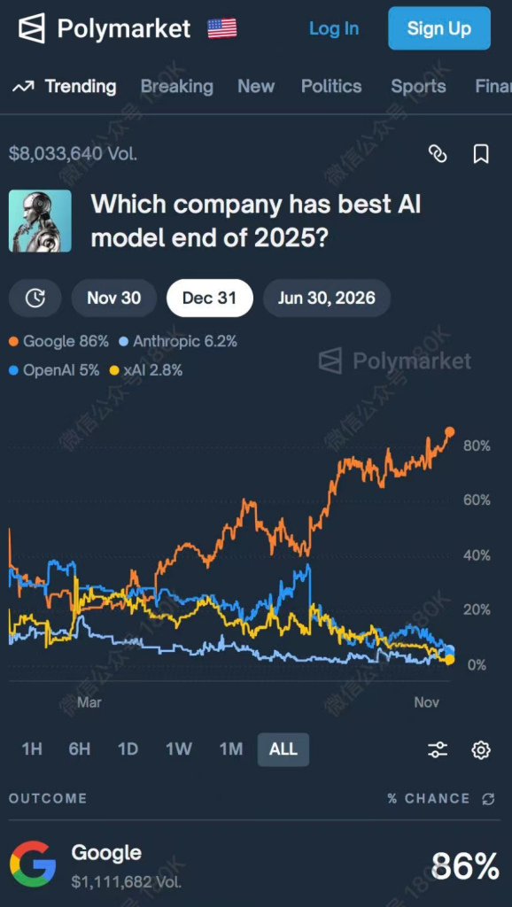 除了上面LMarena的排名以外,还有更接地气的polymarket上的网友下注: