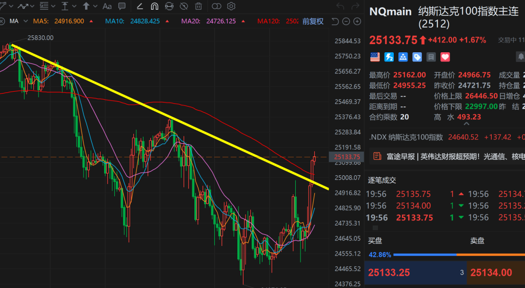 昨天美股盘中谷歌代领大盘反弹,盘后英伟达出财报超出市场预期,盘后又给美股注入强心针,纳指从11月中旬见顶以来,今天算是第二次尝试突破压力位,小时线站上了120小时线,看看后续持续能力如何吧——可以参考昨天的笔记里说了要等个回踩确认的方法。