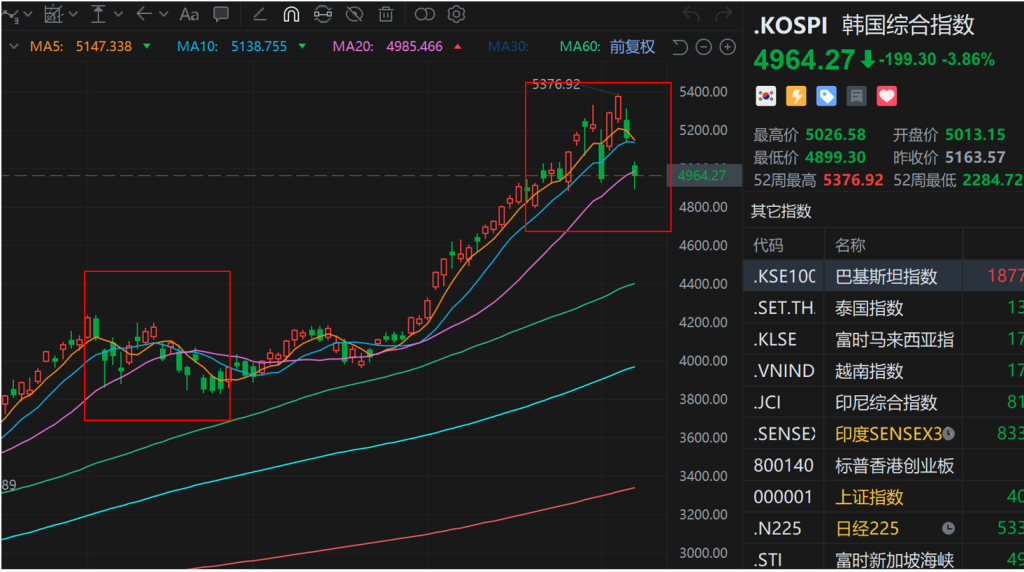 2025年10月6日,大饼带着只涨不跌的神话(类似这次黄金和白银)在这一轮行情里冲到历史高位的12万,之后开始自己回调,并没影响科技股,韩国综指在11月3日还创下 4,221.87 的历史新高。但从11月7日左右,市场开始出现“大饼和科技股”同步的趋势。韩国大部分人左右持饼,右手持科技股,同一批人在交易同一类风险偏好资产。而饼圈又充斥着大量高杠杆账户,一旦爆仓,需要补保证金或赎回现金,最直接的资金来源往往就是股票仓位,于是股市被动卖出。