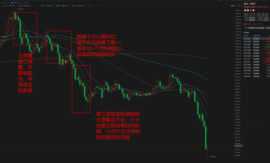 这一次其实跟去年11月那次直接原因是一样的,只是这次多了贵金属金银。金银因为之前交易的过于夸张,所以空头在金银上开了第一枪,但目前引领去杠杆的并且向科技股传递最顺畅的还是大饼(btc)。