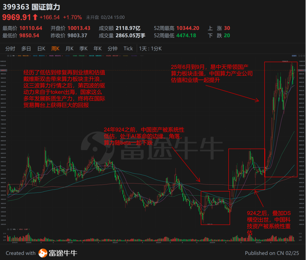 在经历了924之前系统性低估,再到924之后的估值修复再到25年6到9月板块随着业绩和估值提升形成戴维斯双击带来算力板块主升浪,这三波算力行情之后,肯定是没有结束的。未来第四波的驱动力来自于国内AI应用渗透率不断提升,各种应用场景落地,以及国产token出海,国家这么多年发展新质生产力,终将在国际贸易舞台上获得巨大的回报。