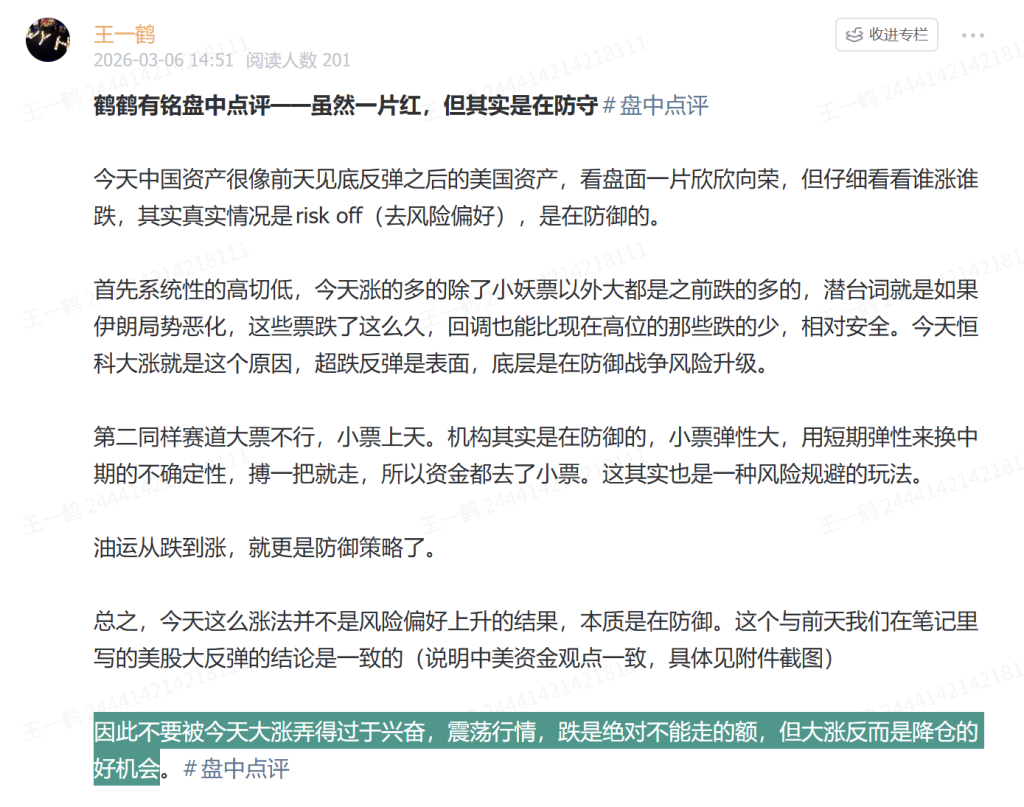我们的观点是,伊朗战争不会一直恶化,但也不会马上结束。航路不会一直堵塞,但只要战事在持续,也不会马上恢复到战前那样。这个事件不解决之前,市场的短期很难过前高,但油价涨的越高,川普就越可能随时taco,一旦有战事缓和的迹象,跌的多的自然就要暴力反弹。所以后续保持震荡形态的交易策略。就像周五一片红盘的时候,我们盘中笔记说的一样,上涨中减仓,下跌中慢慢加仓是比较舒服的做法。