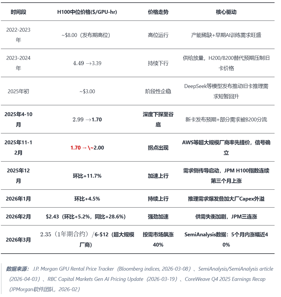 底层原因还是AI产业需求爆发景气度非常高,最直接的反应是算力租赁价格在今年前三个月加速上涨,下面是H100的价格走势,H100于2022年发布,是比较老的型号,理论来说应该是随着产品升级越来越便宜,当H100价格快速上涨,只能说明高端算卡已经完全不够用了,算力需求溢出才能导致低端算卡价格上涨: