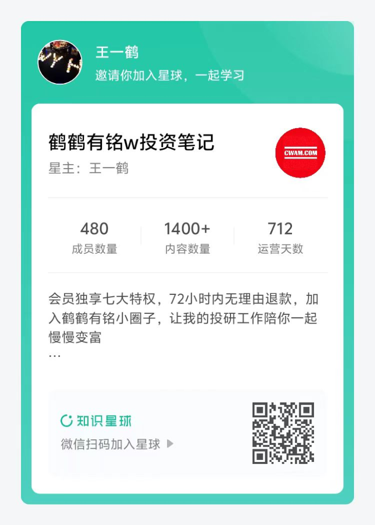 欢迎扫码加入鹤鹤有铭的小圈子,我们的年费平均每个月99元(72小时内无理由退款),这是我们对星球里相关研究、运营同事工作的价值定价,希望有共同价值观的朋友能够加入鹤鹤有铭星球大家庭,让我们抱团取暖,一起慢慢变富。